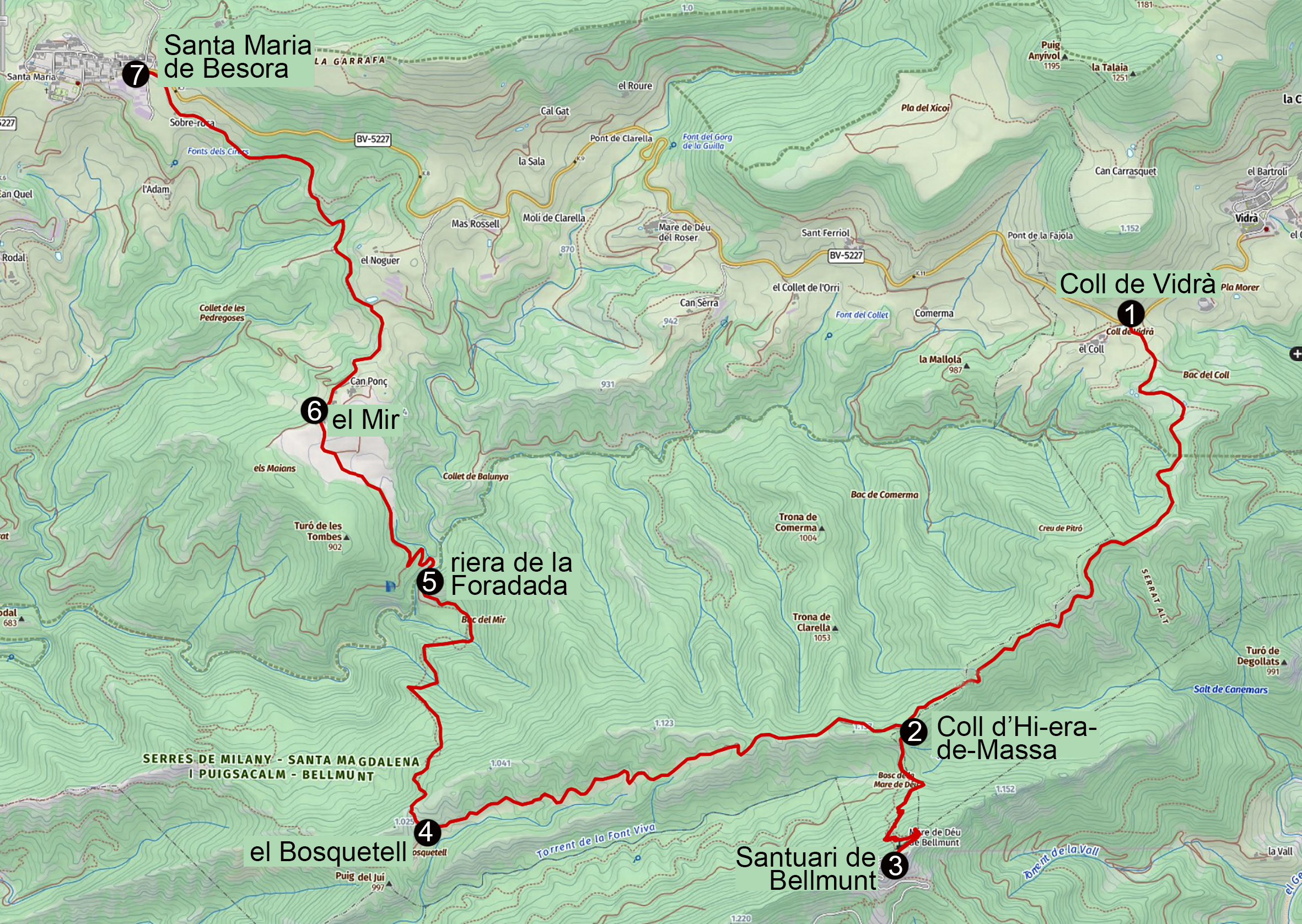 Itinerari de muntanya: Coll de Vidrà (1), coll d’Hi-era-de-Massa (2), Bellmunt (3), coll d’Hi-era-de-Massa, el Bosquetell (4), riera de la Foradada (5), el Mir (6) i Santa Maria de Besora (7).